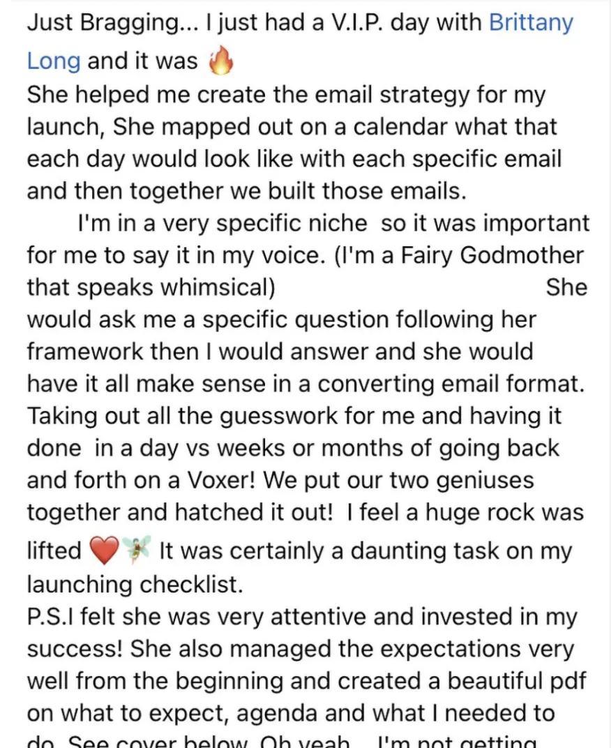 Working with Brittany Long for over a year has truly transformed my business. Brittany is amazing, innovative, and incredibly encouraging. She helped me identify the bottlenecks in my business and prioritize the right strategies to address them, especially with integrating AI. Thanks to her expertise, I was able to put systems in place that made my business run so much more smoothly and set the stage for real growth. Brittany's approach made everything feel manageable and exciting, and I'm so grateful for her guidance and support. If you want to streamline your business and make meaningful progress, Brittany is the coach you need!